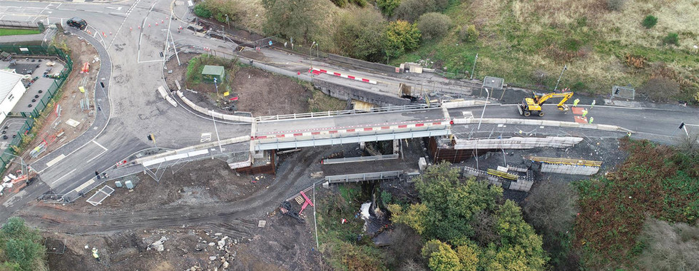 The project was located in Addiewell over the SSSI designated Skolie Burn which splits the town in half and is the only bus-suitable route to service one half of the town. Following an assessment by the Council, the old bridge which was half masonry arch / half 1940s concrete, had been restricted to one lane and a weight limit imposed. The project required us to first construct a temporary 33m span proprietary steel bridge (with pedestrian footpath), on reinforced earth embankments with piled foundations, as an off-line temporary diversion with associated 3-way traffic lights, and street lighting. A second temporary bridge (12m span) was installed to improve access as well as to divert services off the existing bridge (medium pressure gas, HV electric cables, BT fibre and copper cables, water main, and street lighting). The masonry arch, and concrete deck were demolished with the existing concrete abutment half retained and used in the new reinforced concrete (RC) abutment and bridge deck.